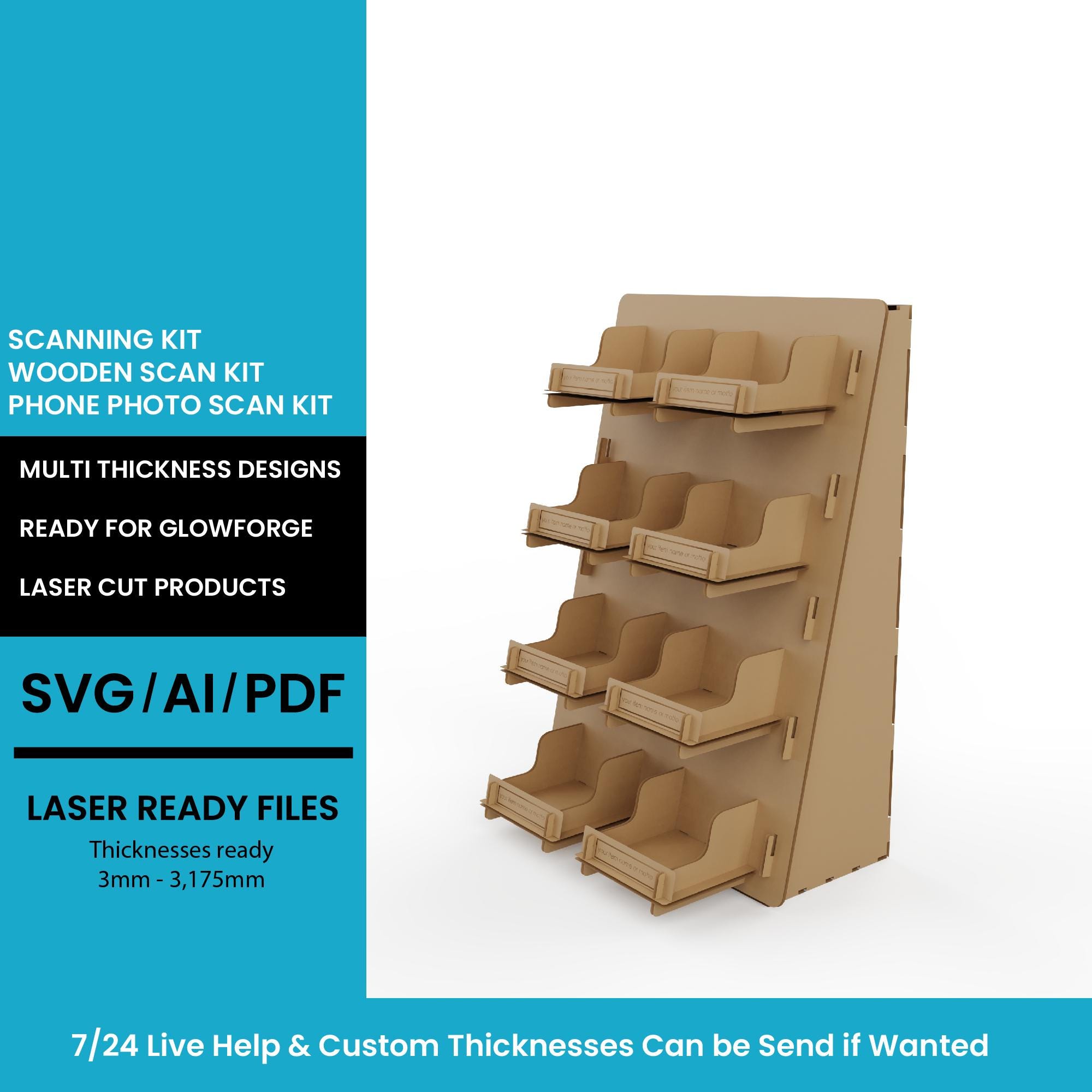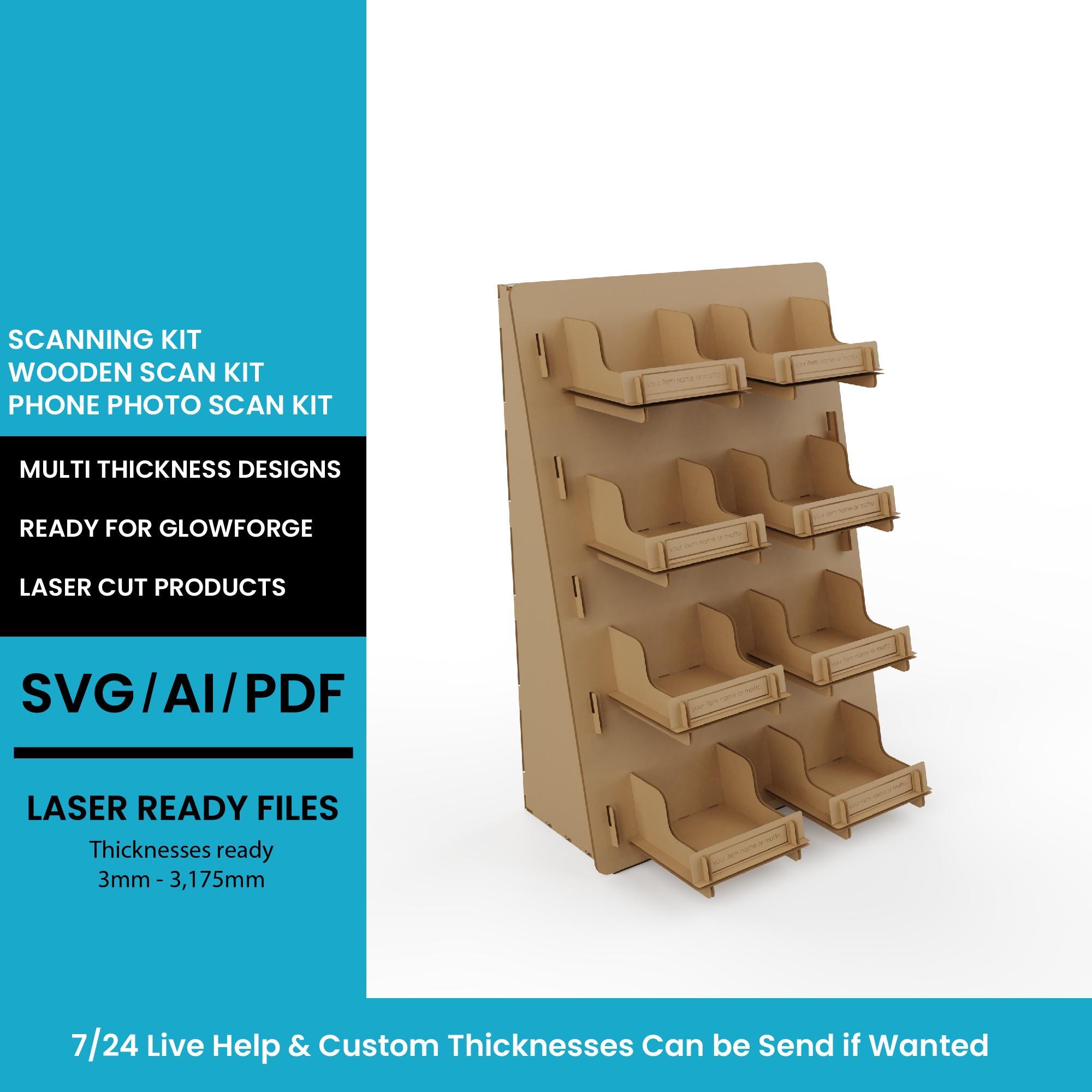 First of all, be aware that you are not only buying a dxf file from us. You are having design service too automatically when you buy anything from us. We allways help our customers if they get stuck or need revisions on the designs. Whether it is thickness changes or dimension changes we allways help as soon as possible.
